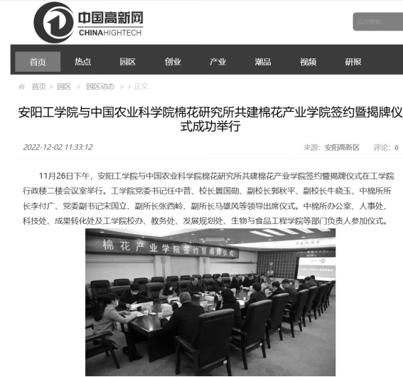 4.中国高新网:beats365与中国农业科公司棉花研究所共建棉花产业公司签约暨揭牌仪式成功举行